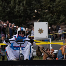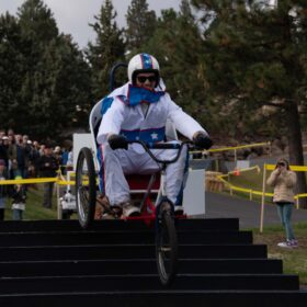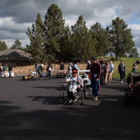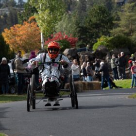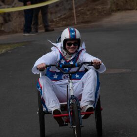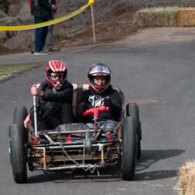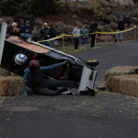 As the team runs to meet at the finish line and assess the damage, it is not just the breaks that are gone, the metal frame is in two pieces. The racing is over for team, Peach’s Posse.