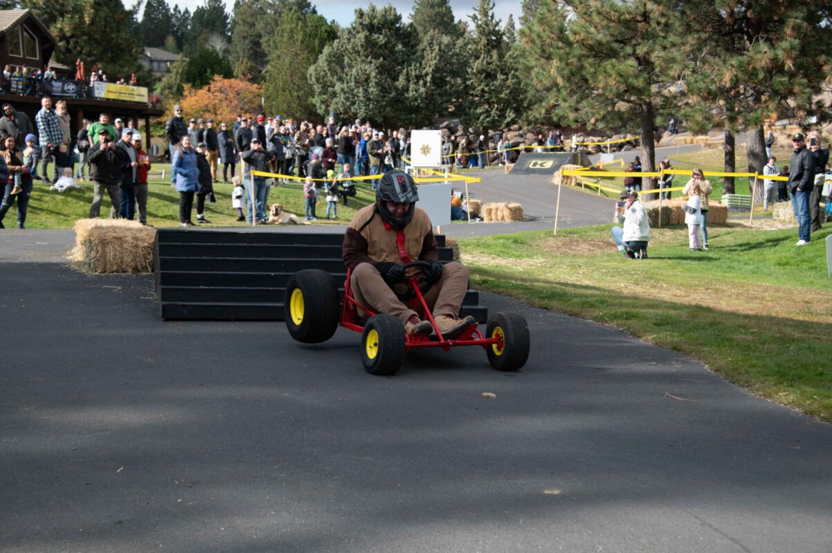 The crowd is anticipating the jump as Peach’s Posse is on the path to lift-off, up the ramp and off the jump! Then down, down, down for a hard landing. The Kart sustained heavy damaged. Breaks are gone! Peach’s Posse Kart is roaring down the straight to the finish line, no breaks and coming in fast! With quick thinking the driver uses his shoe soles to slow and eventually stop the runaway Kart.